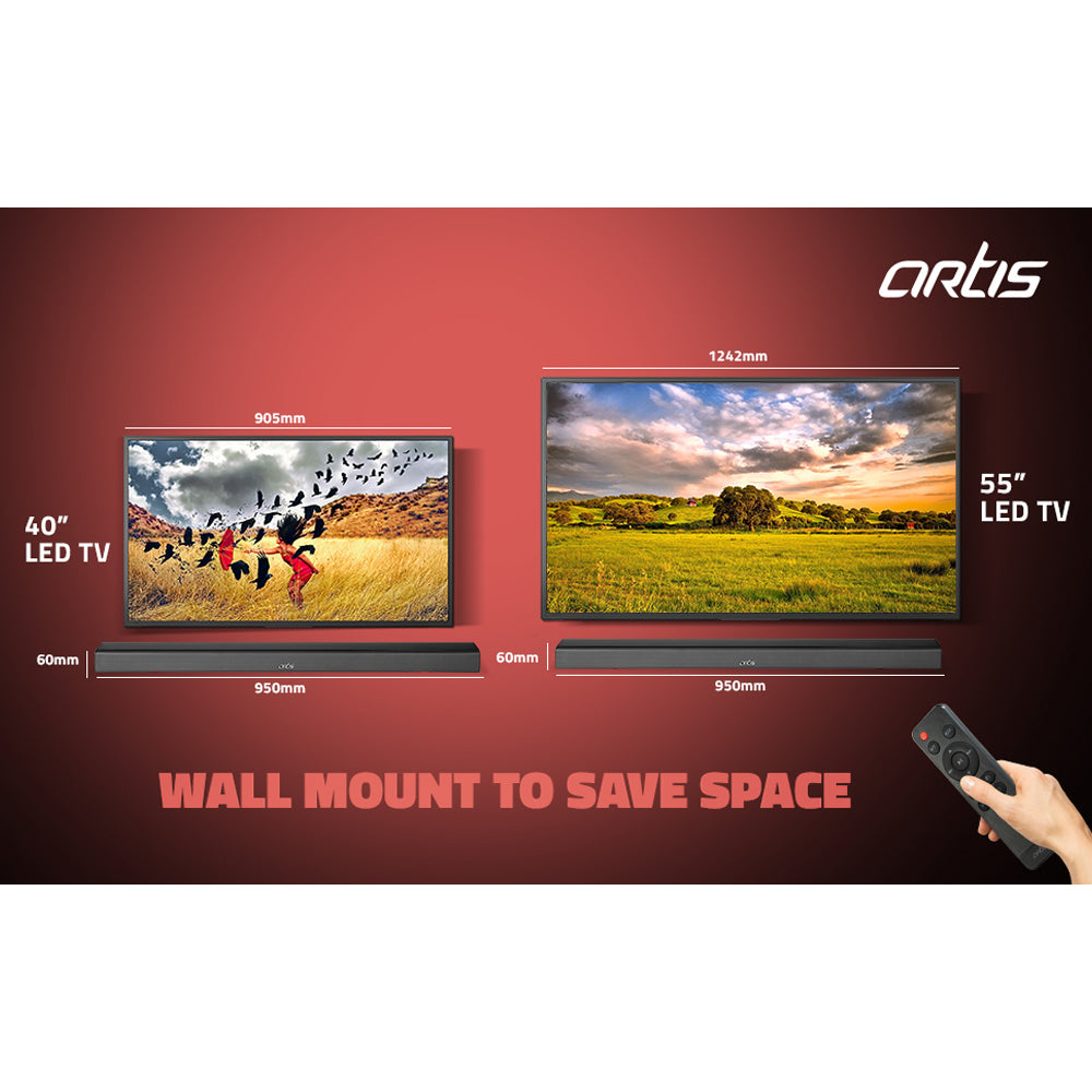 - Technical Specifications: 940x60x65mm size. BT Version: 5.0. Driver Size: 2 inches x 4 driver units. Total Output: 60W RMS. BT Range: 10 Meters Max. USB Input: Yes. Inbuilt Amplifier: Yes. 2 x Passive Radiators. 3 EQ modes. 3D surround Mode. Independent Volume Control. Body: Satin Plastic. Grille: Metal Wired Mesh. Wall mount: Yes.