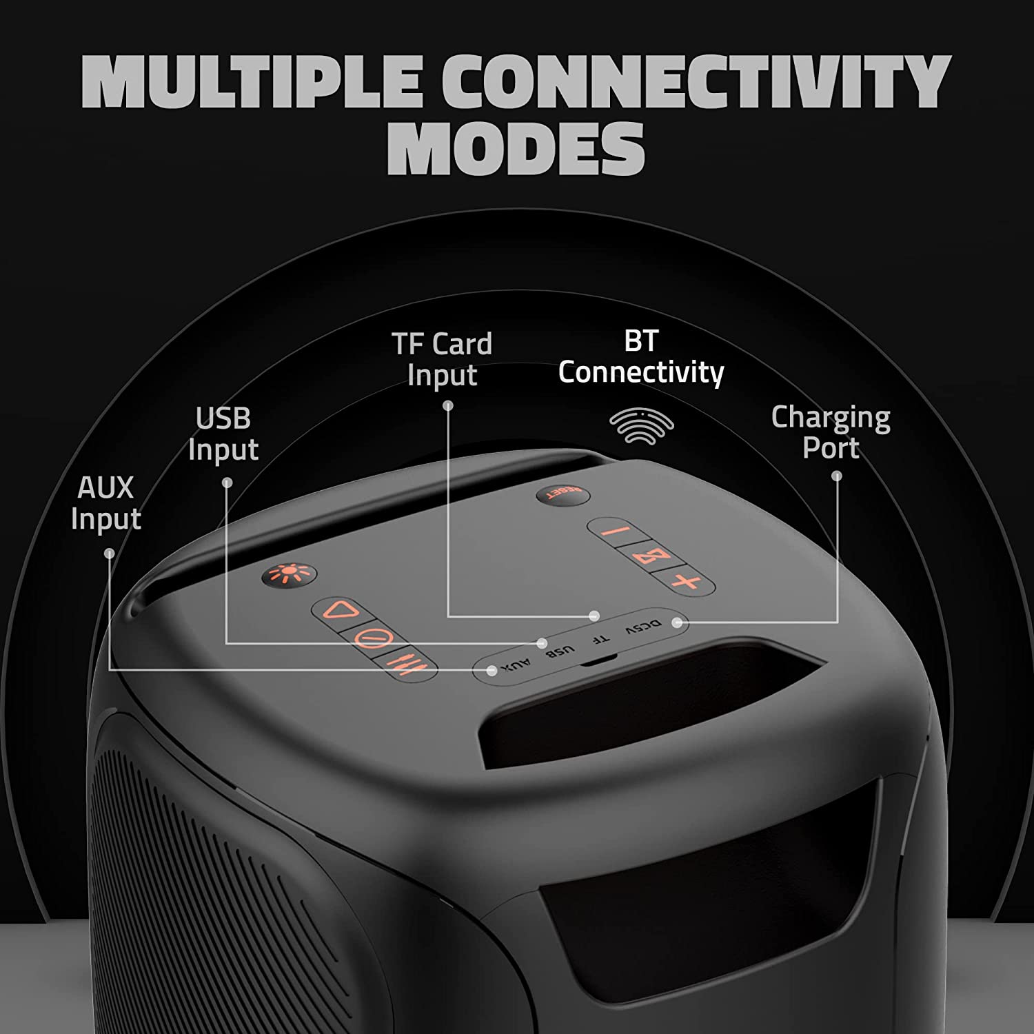 - Multiple Connectivity Modes: USB Type A Charging Port, USB input, TF Card, Aux In support & Wireless Mic