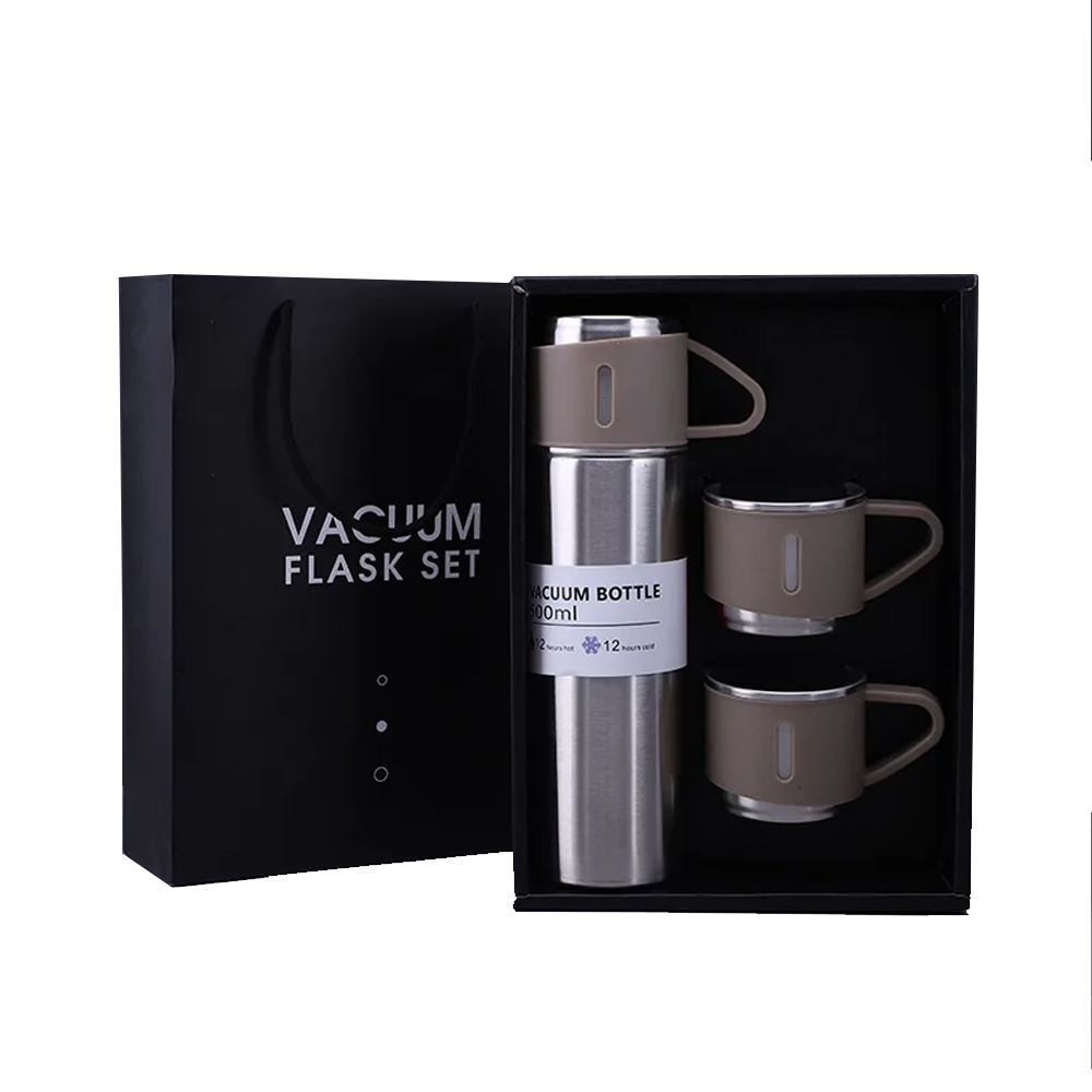 Premium Drinkware: Elevate your drinking experience with our premium-quality stainless steel vacuum flask set. Designed to keep your beverages at the perfect temperature for longer durations, it ensures every sip is as refreshing as the first.